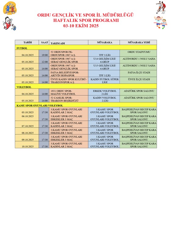 03-10 Ekim 2025 Haftalık Spor Faaliyet Programı aşağıdaki tabloda belirtilmektedir. Spor Dolu günler dileriz.