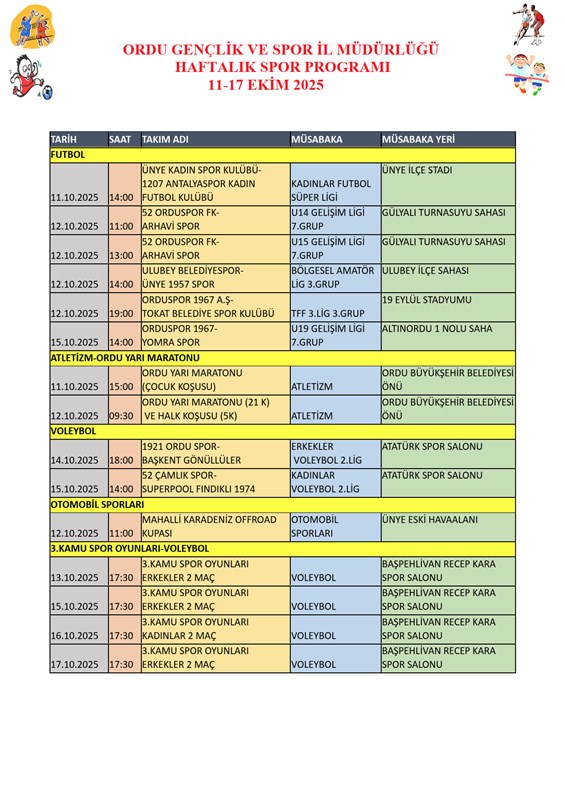 11-17 Ekim 2025 Haftalık Spor Faaliyet Programı